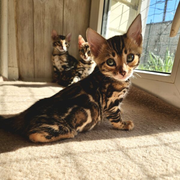 Read moreMaisonleopard Lily has beautiful tricolour pattern with golden colour. She has big rosettes with very nice contrast. She is very affectionate kitten, very social and brave.
